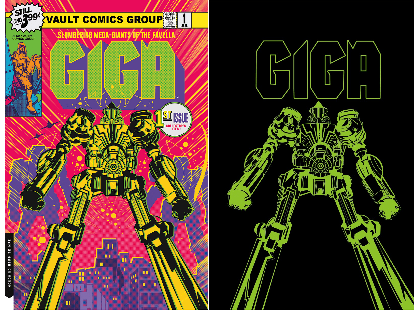 This Ultimate Comics exclusive is a blacklight style recolor of the Cover B variant featuring artwork by Tim Daniel and Nathan Gooden. The Image is an homage to the classic giant robot adventure Marvel’s Shogun Warriors #1, by Herb Trimpe. The black and green is the Glow in the Dark overlay image, show what your book will look like once the lights are off!