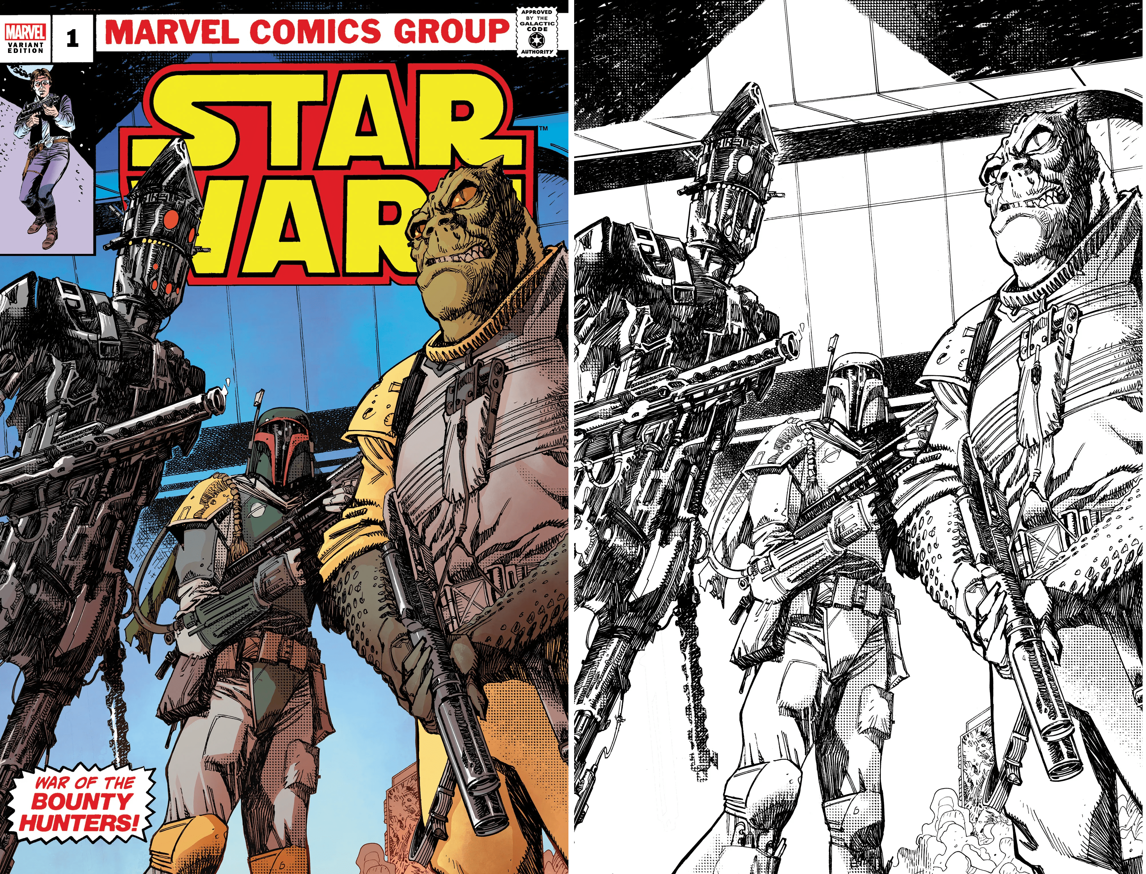 Lot is one copy of both of the the Ultimate Comics Exclusive Star Wars War of the Bounty Hunters #1 variants, one color version with the classic Star Wars comic logo, and one with the original black and white virgin artwork, by Superstar Disney/ Lucasfilm artist John McCrea, featuring the incredibly popular Bounty Hunters from the Empire Strikes Back, Boba Fett. IG-88, and Bossk. These books are STRICTLY LIMITED and we expect them to sell out FAST, so collect this bounty ASAP, while they’re still available!